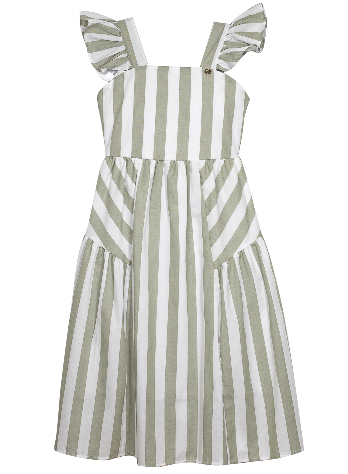 Vestido infantil em tecido de algodão, decote reto, alças com babadinho, pala, saia franzida com recortes nas laterais. Abotoamento nas costas.