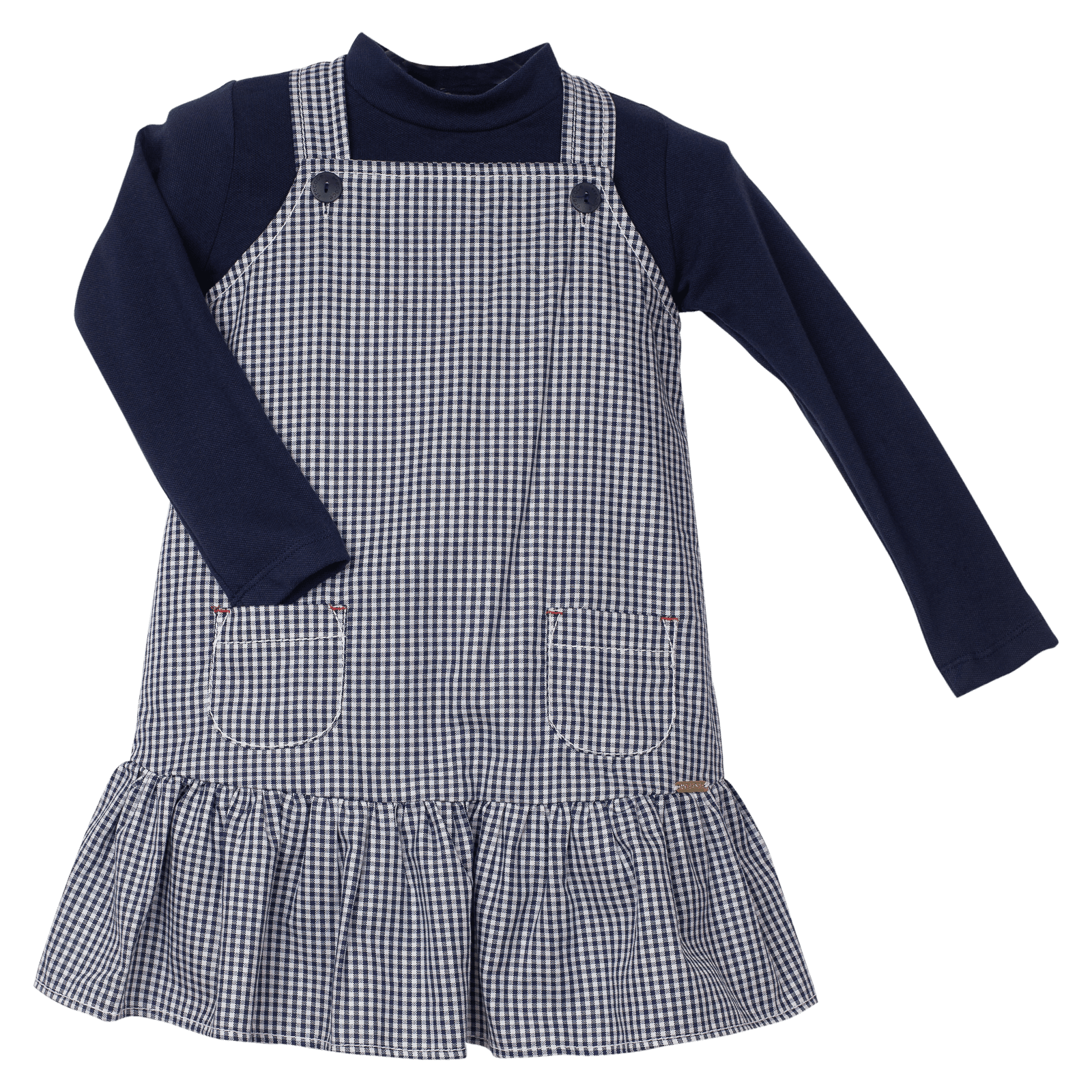 Conjunto infantil feminino, vestido salopete em tecido de algodão com bolsos e abotoamento na frente, babado na barra. Blusa em malha piquet, gola alta, manga longa, abotoamento nas costas.