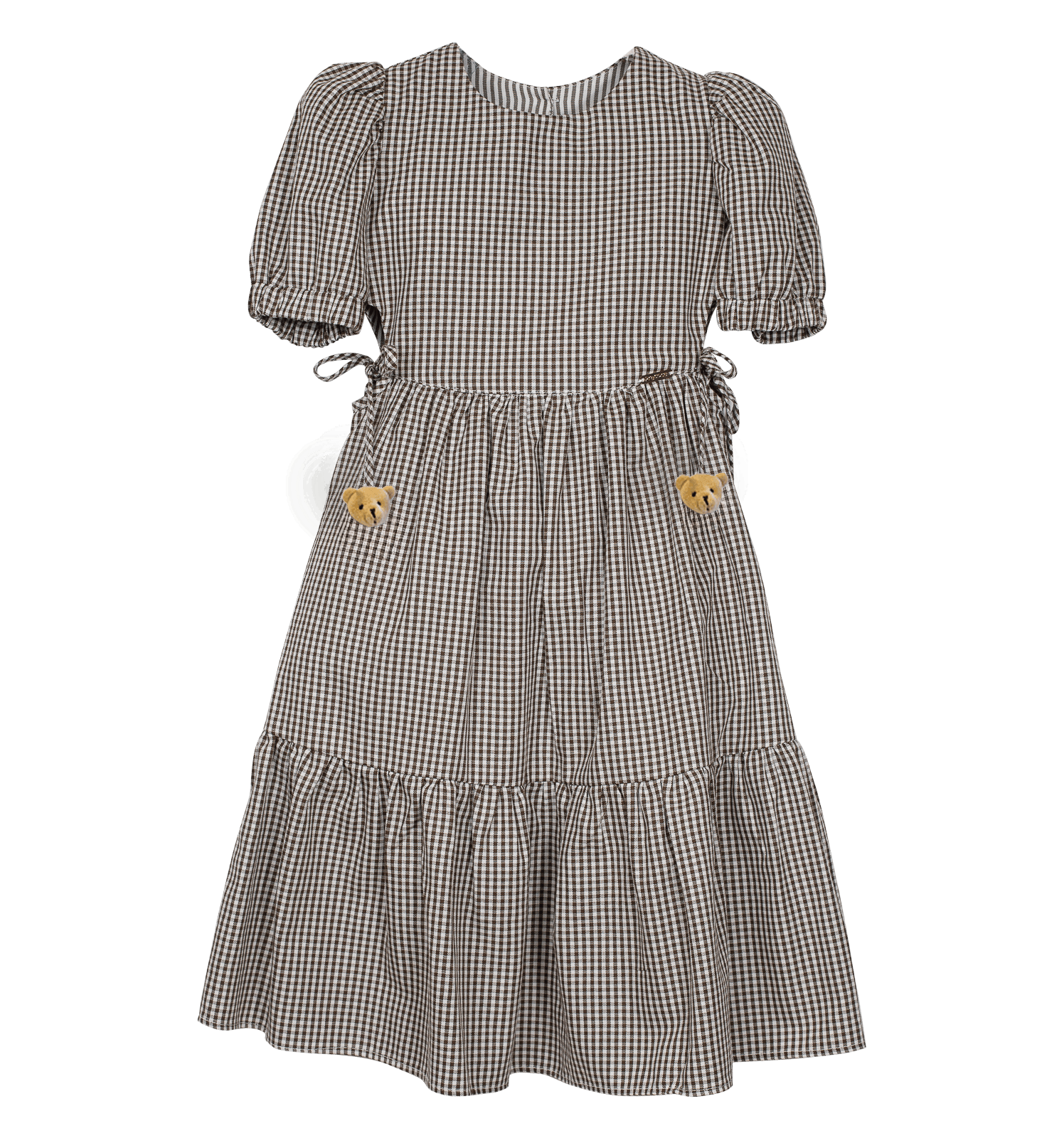 Vestido infantil em tecido de algodão, decote em U,mangas fofas,recorte nas laterais com abertura e amarração, ponteira de ursinho. Abototmanto nas costas.