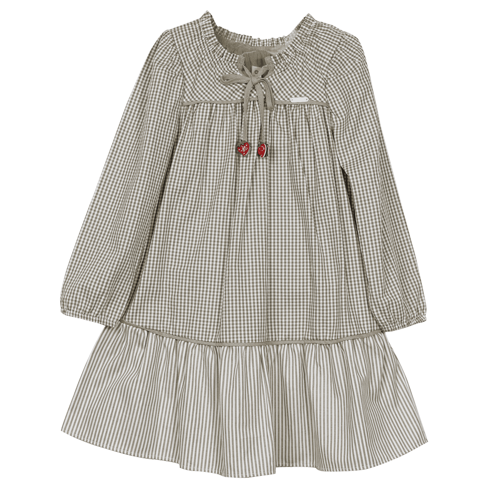 Vestido infantil em tecido de algodão, decote em U com abertura, amarração e ponteira de moranguinho de crochê, mangas longas, modelagem soltinha com vivos embutidos.