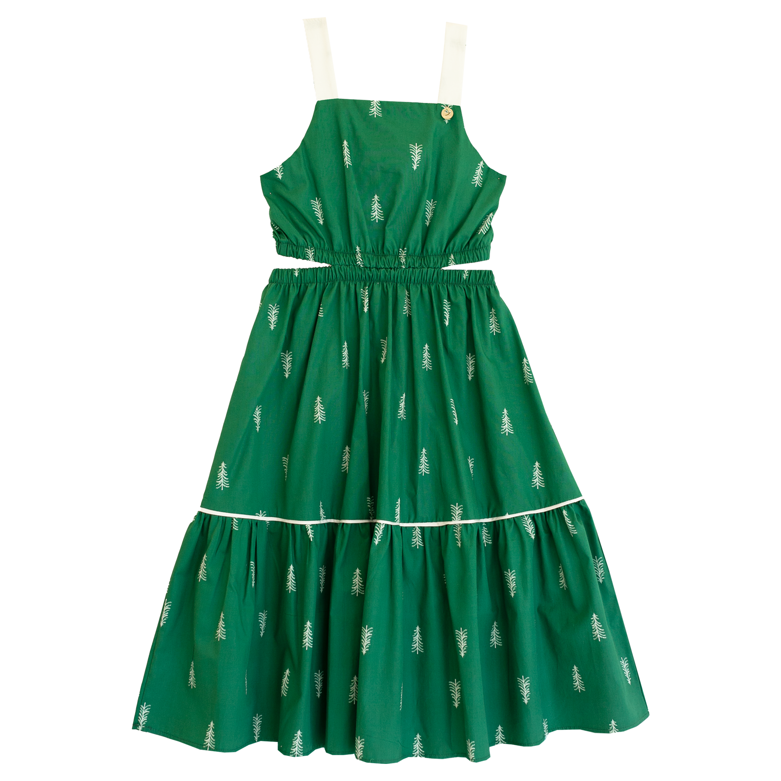 Vestido infantil em tecido de algodão, decote e cava com modelagem reta, alças, decote com abertura na cintura e elástico, babado na barra e vivo embutido. Feito com a nossa estampa exclusiva “Pinheirinho Fundo Verde Escuro”.