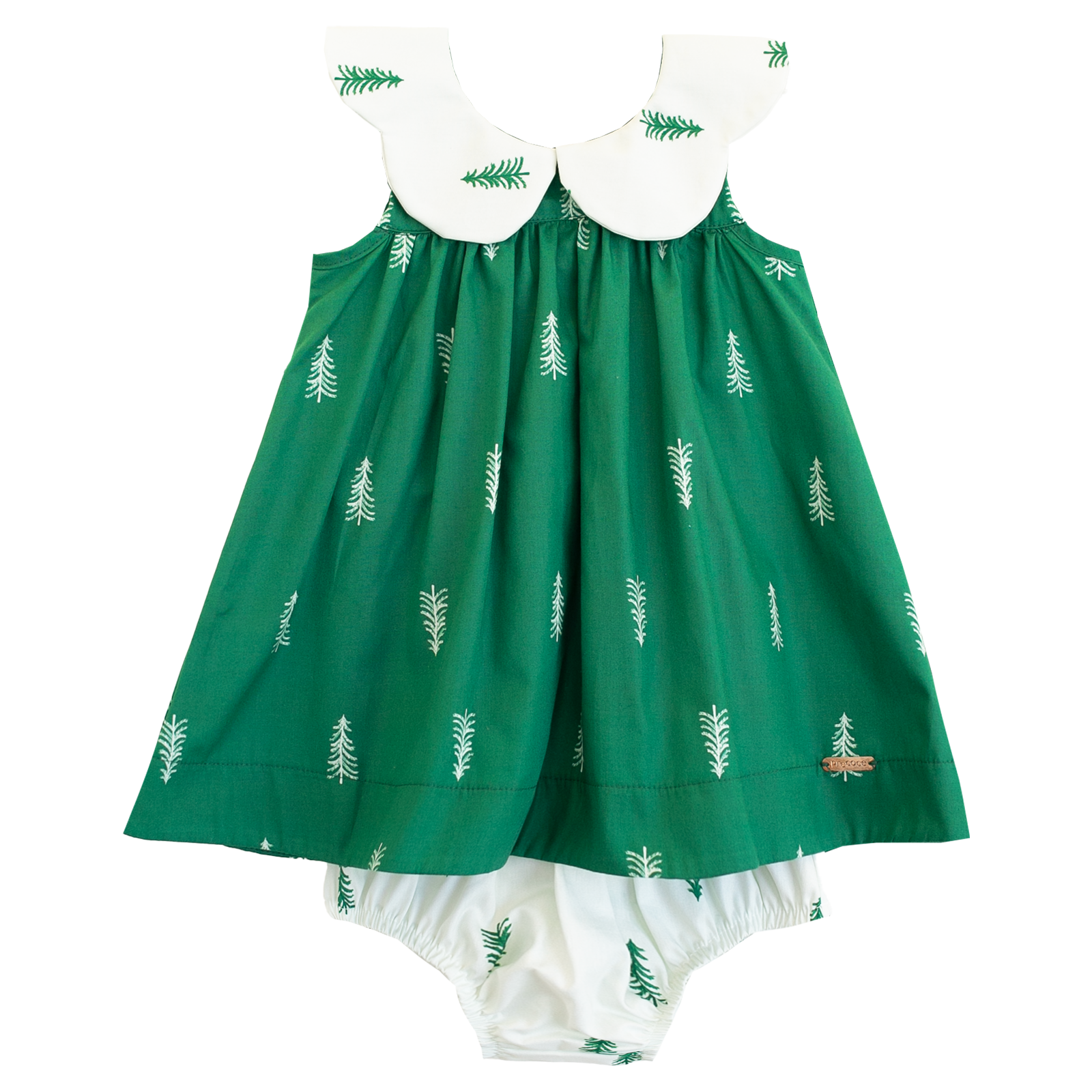 Vestido infantil em tecido de algodão, decote em U com gola ondulada, pala pequena, modelagem evasê soltinha e confortável. Calcinha com elástico na cintura e entre as pernas. Feito com a nossa estampa exclusiva “PINHEIRINHO FUNDO VERDE ESCURO”.