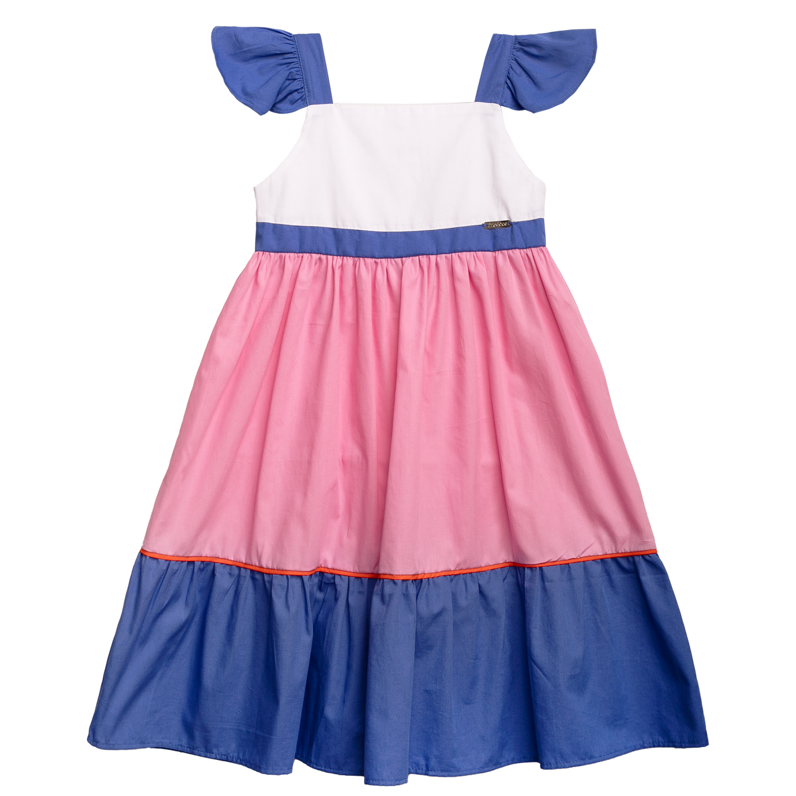 Vestido infantil em tecido de algodão. Pala média, alças com babadinhos formando uma manguinha, abotoamento nas costas, saia franzida e detalhe no composê na barra do vestido e vivo no entre meio da costura.