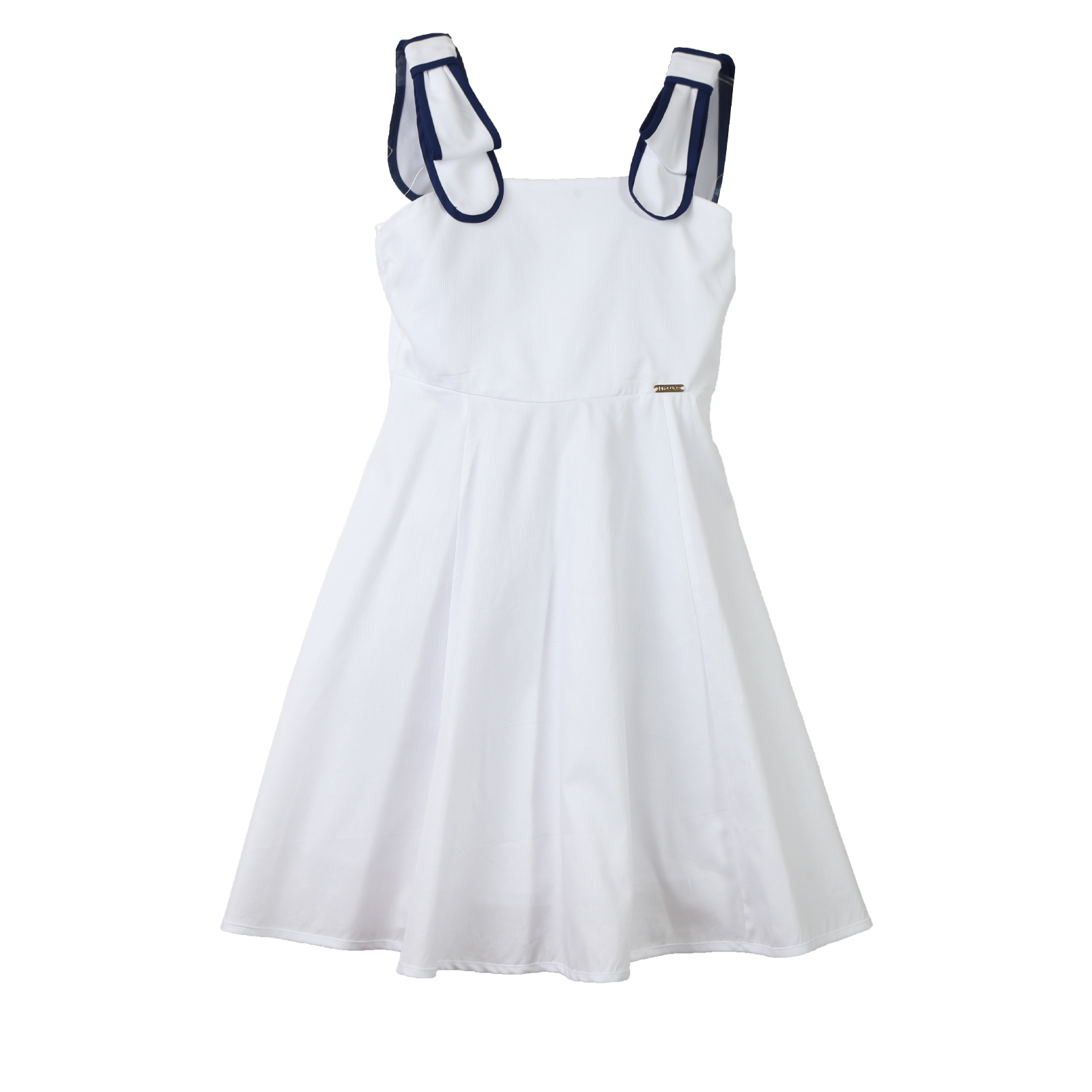 Vestido infantil em tecido de algodão, decote reto, alças com laços, modelagem evasê. Soltinho e confortável. Abotoamento nas costas.