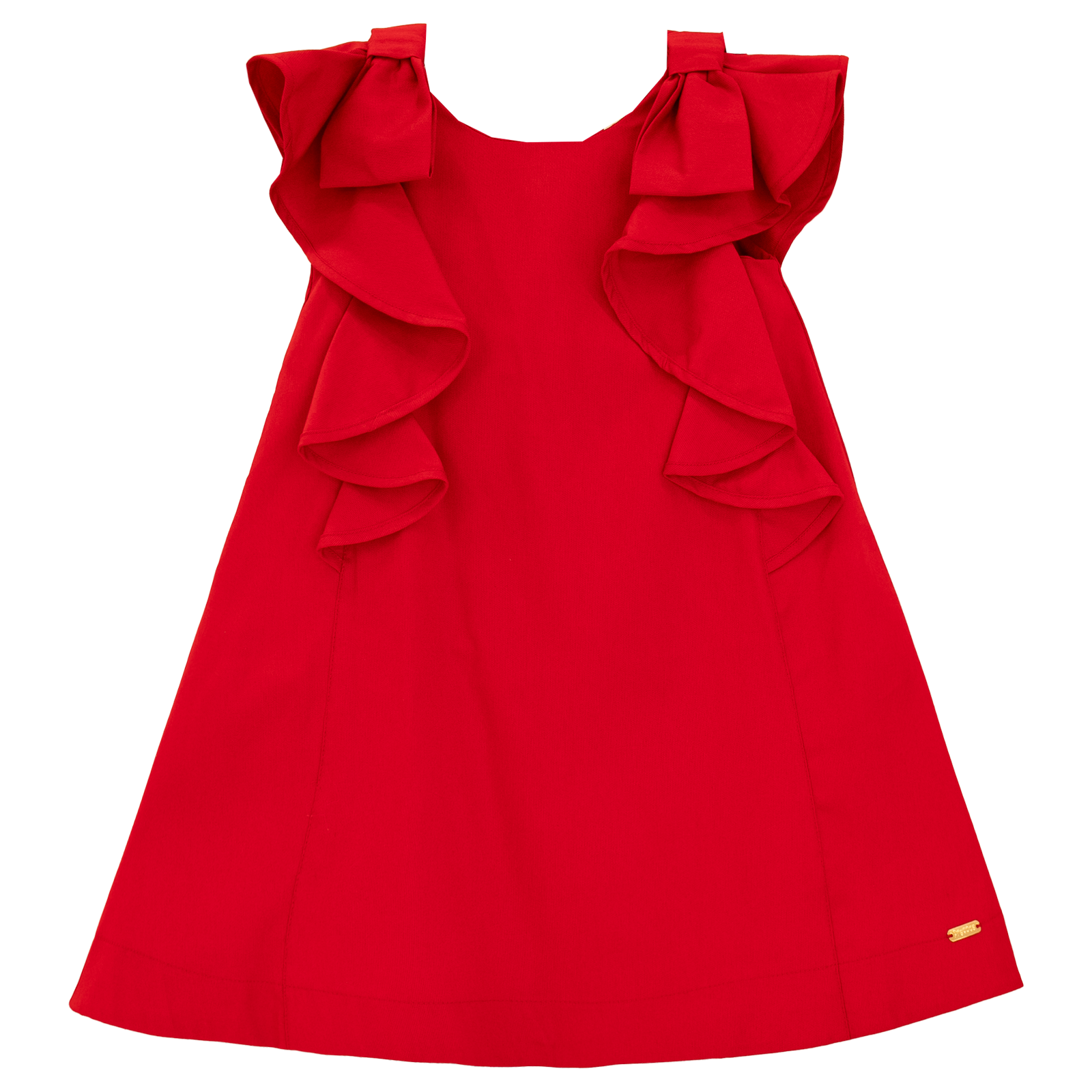 Vestido infantil em tecido de algodão, decote em U, modelagem evasê com detalhe jabour na manga e laço, abotoamento nas costas. Soltinho e confortável.