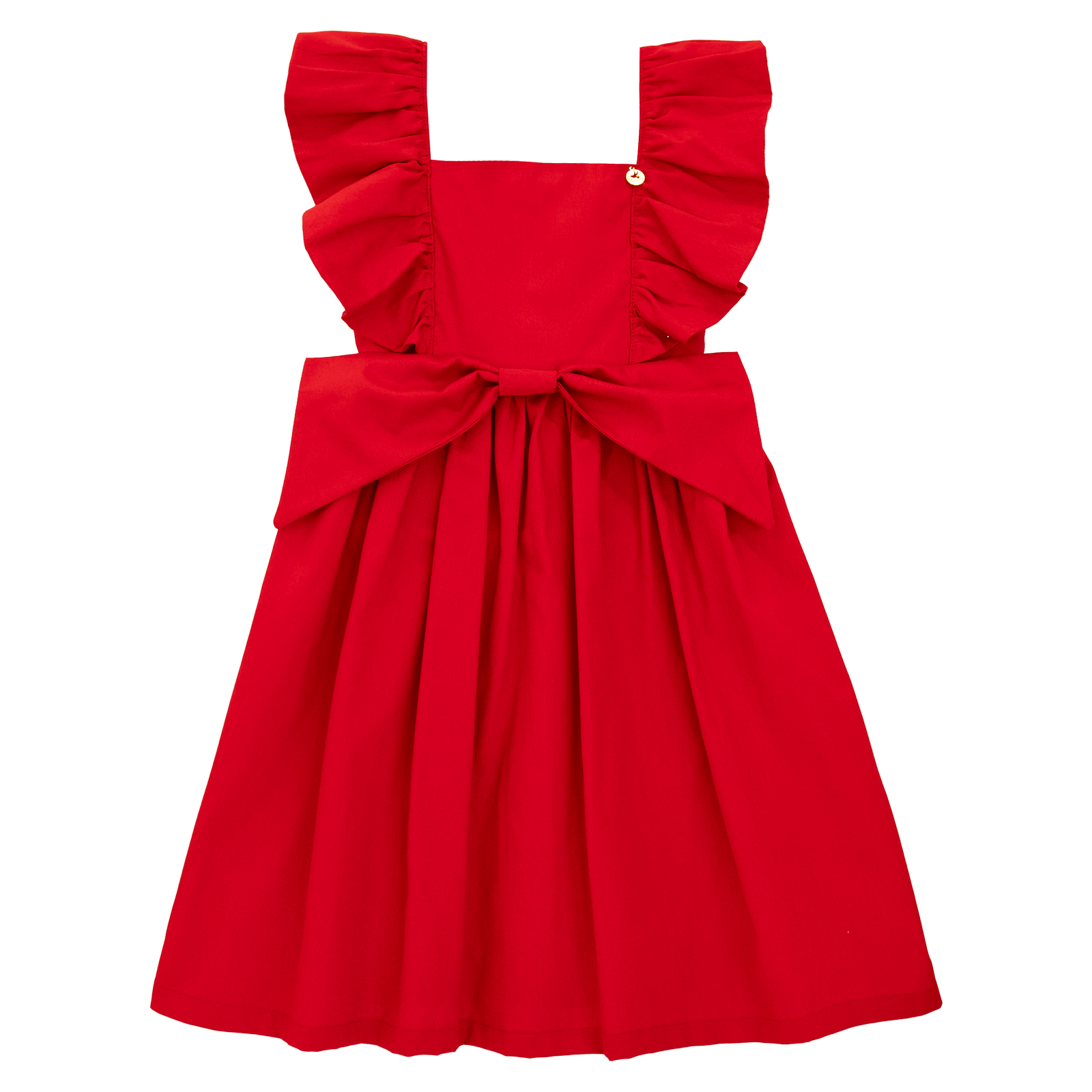 Vestido infantil em tecido de algodão, decote reto, mangas de babados embutidos na pala, saia franzida com maxi laço preso à cintura e lateral, decote com amarração e abotoamento nas costas.