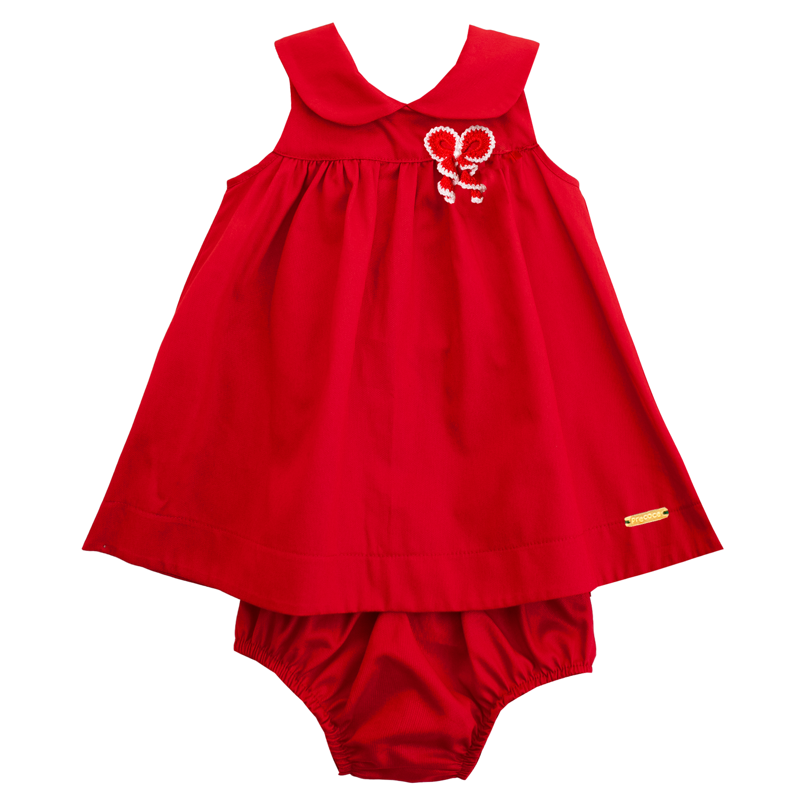 Vestido infantil em tecido de algodão com leve textura, gola bebê, pala pequena franzida e abrindo a roda do vestido, abotoamento nas costas, bordado de crochê, modelagem soltinha e confortável. Calcinha com elástico na cintura e entre as pernas.