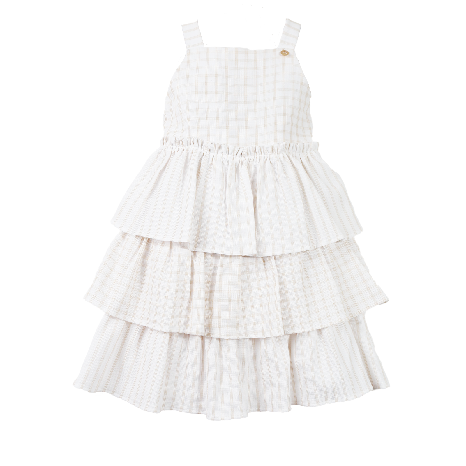 Vestido infantil em tecido de algodão, decote reto, alças, pala, lastex nas costas, modelagem ampla com babados.
