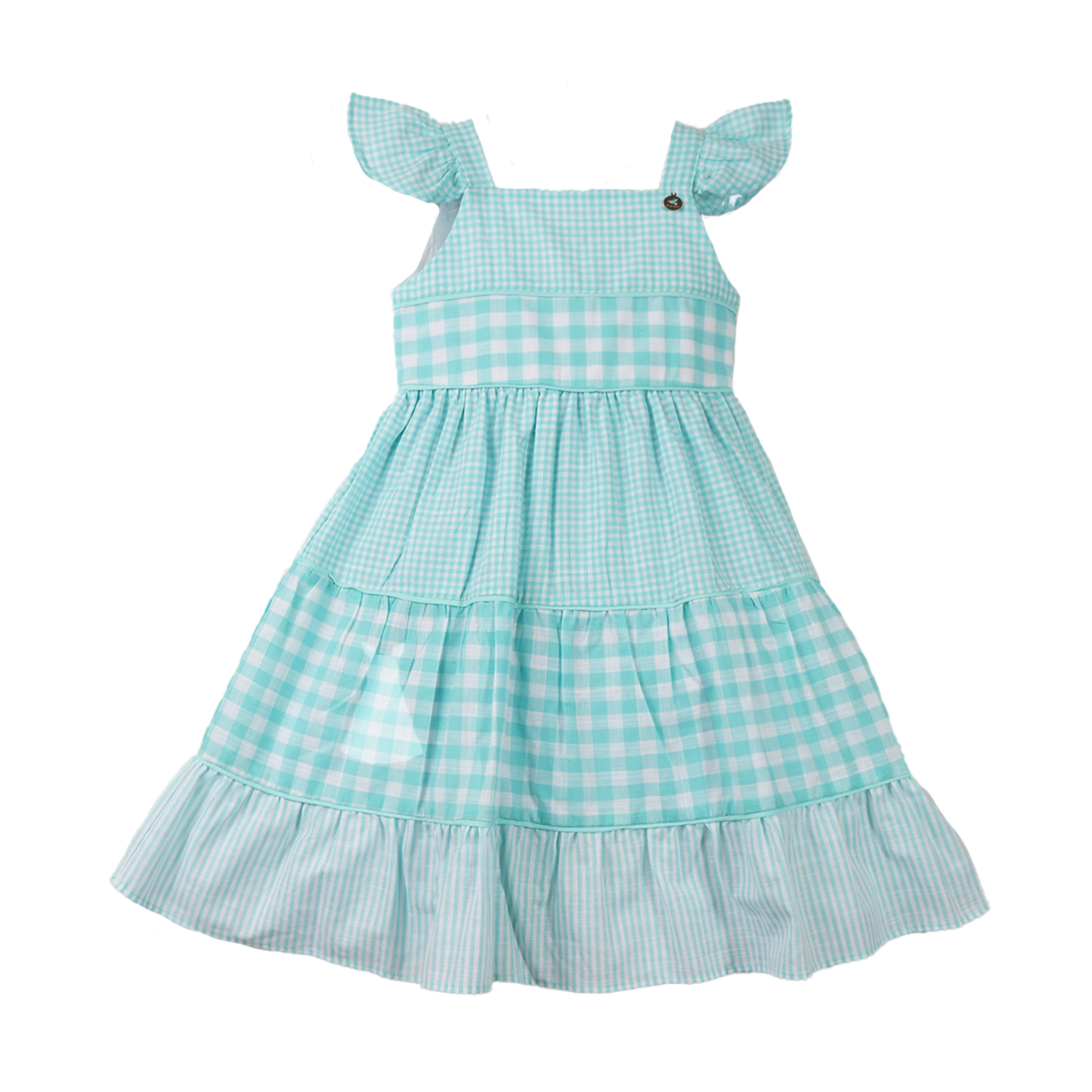Vestido infantil em tecido de algodão, decote reto, alça com babadinho, pala média com recorte e vivo embutido, saia com babados e vivos, soltinho e confortável, abotoamento fácil nas costas.
