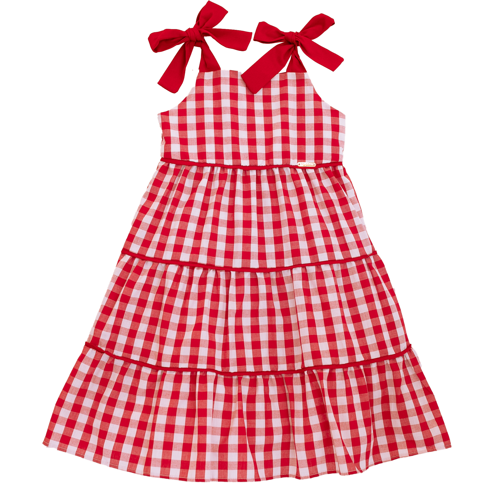 Vestido Xadrez infantil em tecido de algodão 3 marias, decote reto com alças para amarrar, pala e vivo embutido nos recortes, abotoamento nas costas.