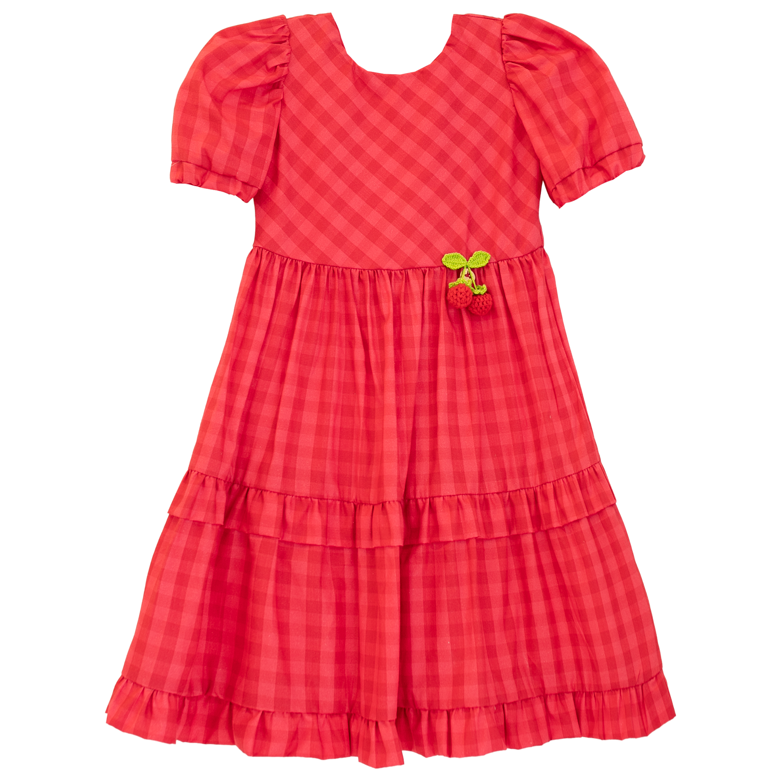 Vestido infantil xadrez em tecido de algodão, decote em U pala franzindo e abrindo a roda da saia do vestido, recortes franzidos na saia com babadinho entre a costura, mangas fofas com elástico, Aplique bordado de crochê na cintura. Abotoamento nas costas.