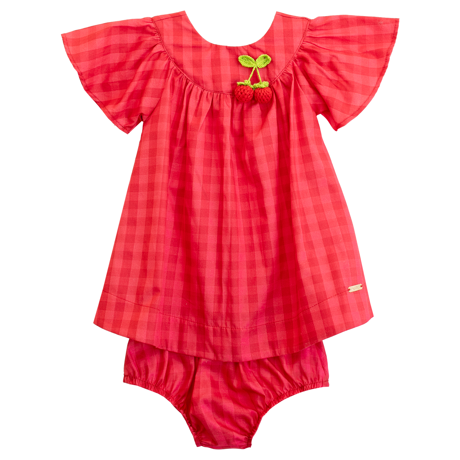 Vestido xadrez infantil em tecido de algodão, decote em U, pala redonda com bordado de cerejinhas em crochê, manguinhas amplas com franzido, modelagem evasê, soltinho e confortável, abotoamento nas costas. Calcinha com elástico na cintura e entre pernas.